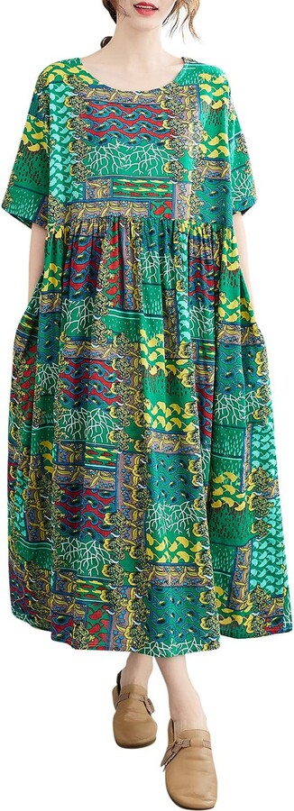 Women Vintage Loose Dress Contrast Color Print Half Sleeves Robes Oversized Cotton Linen Casual Dress